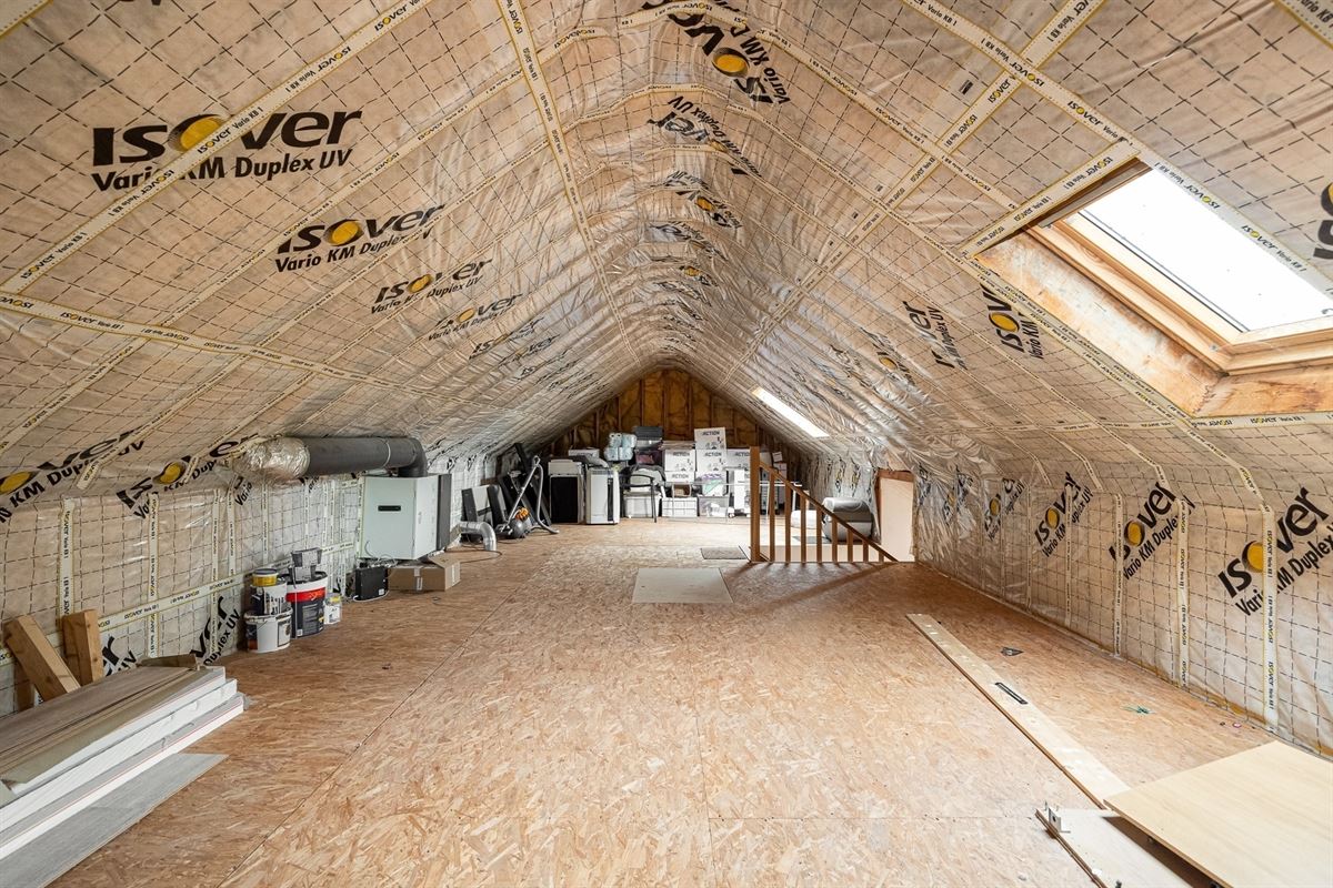 Op de eerste verdieping bevinden zich drie volwaardige slaapkamers, waarvan de master bedroom is uitgerust met een eigen dressing. De moderne badkamer biedt alle comfort met een dubbele wastafel, ligbad en inloopdouche. Op de tweede verdieping bevindt zich de grote zolder van 56m² met twee dakramen dewelke toegangkelijk is via een vaste trap, volledig naar wens in te richten tot bijkomende kamers, bureau of extra bergruimte.