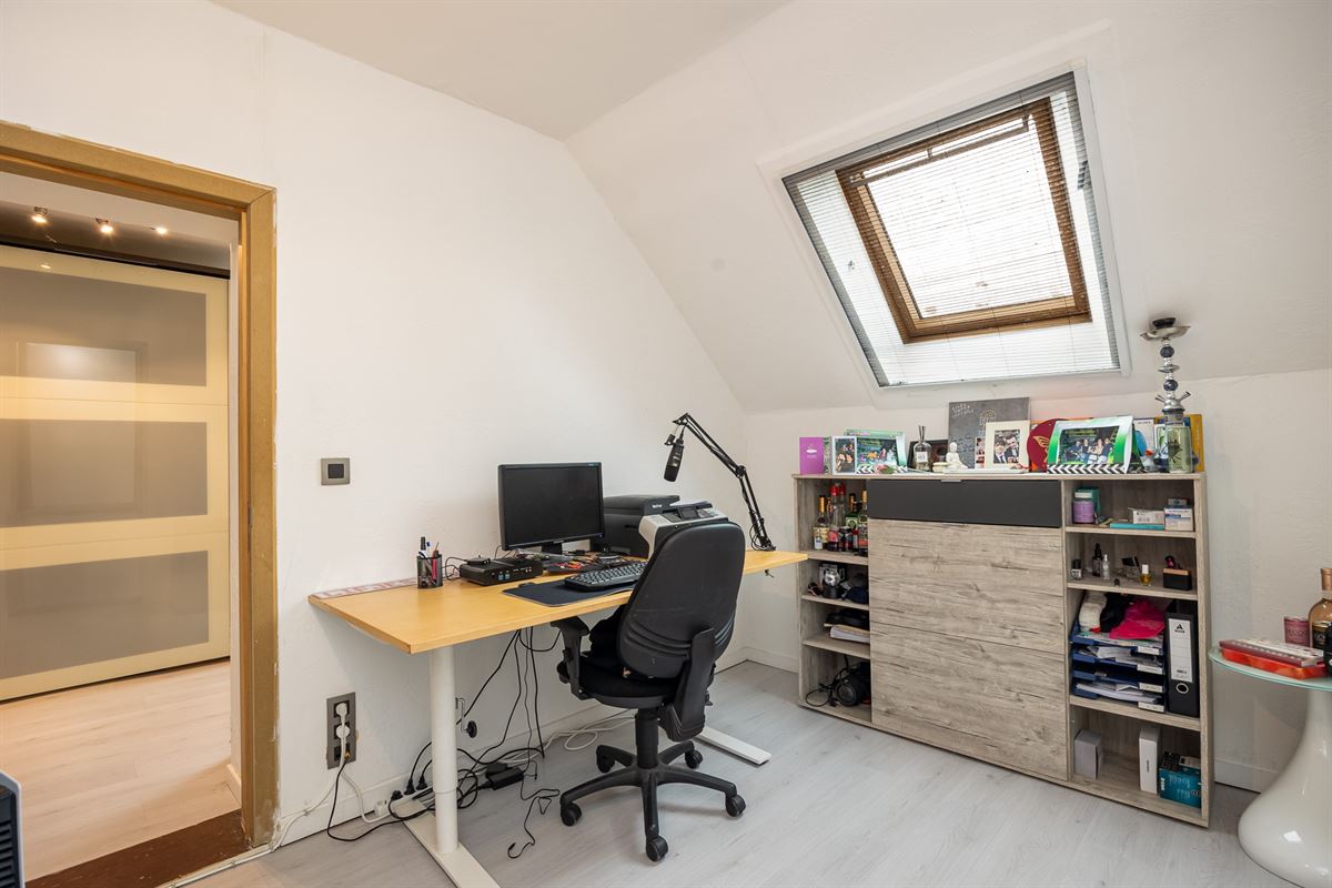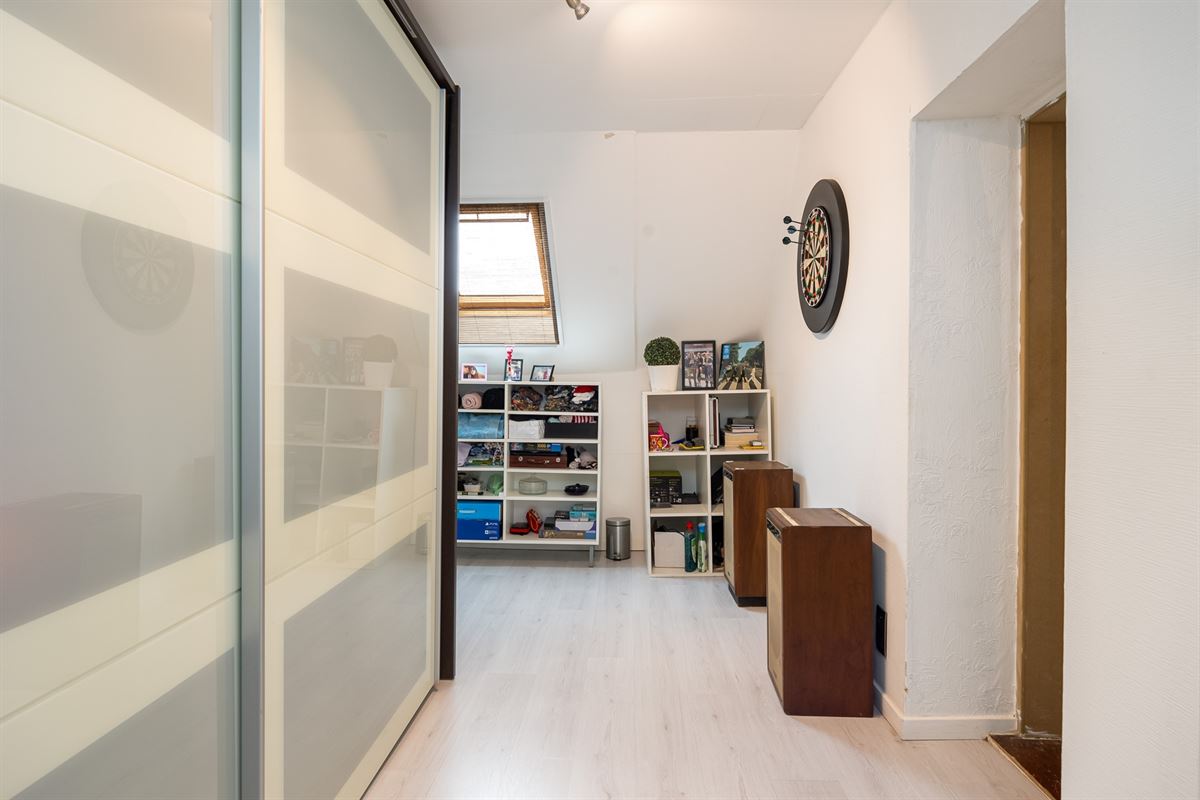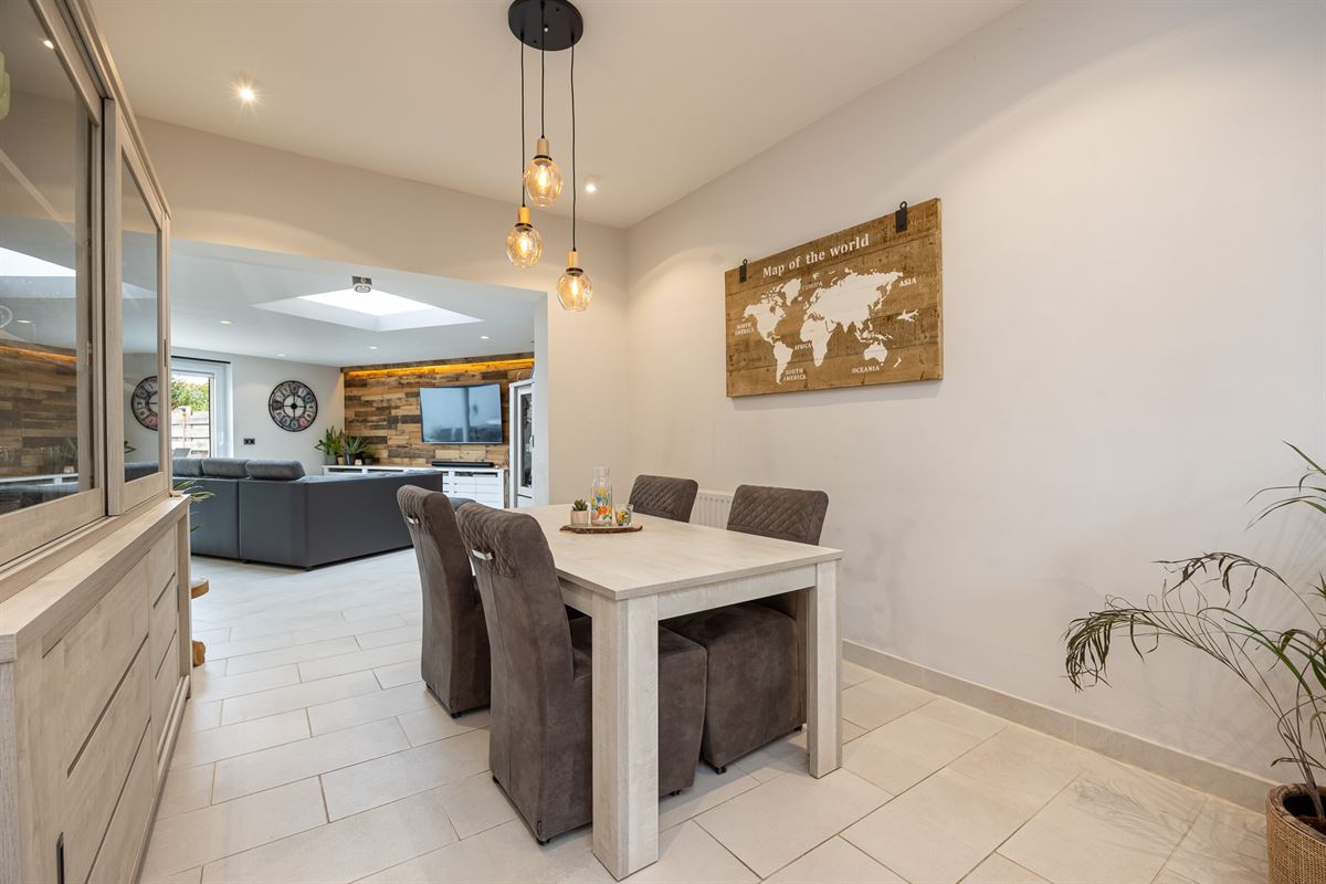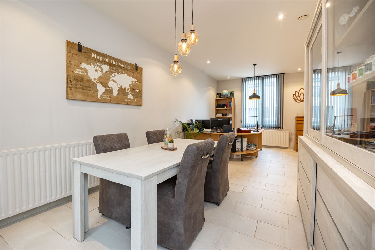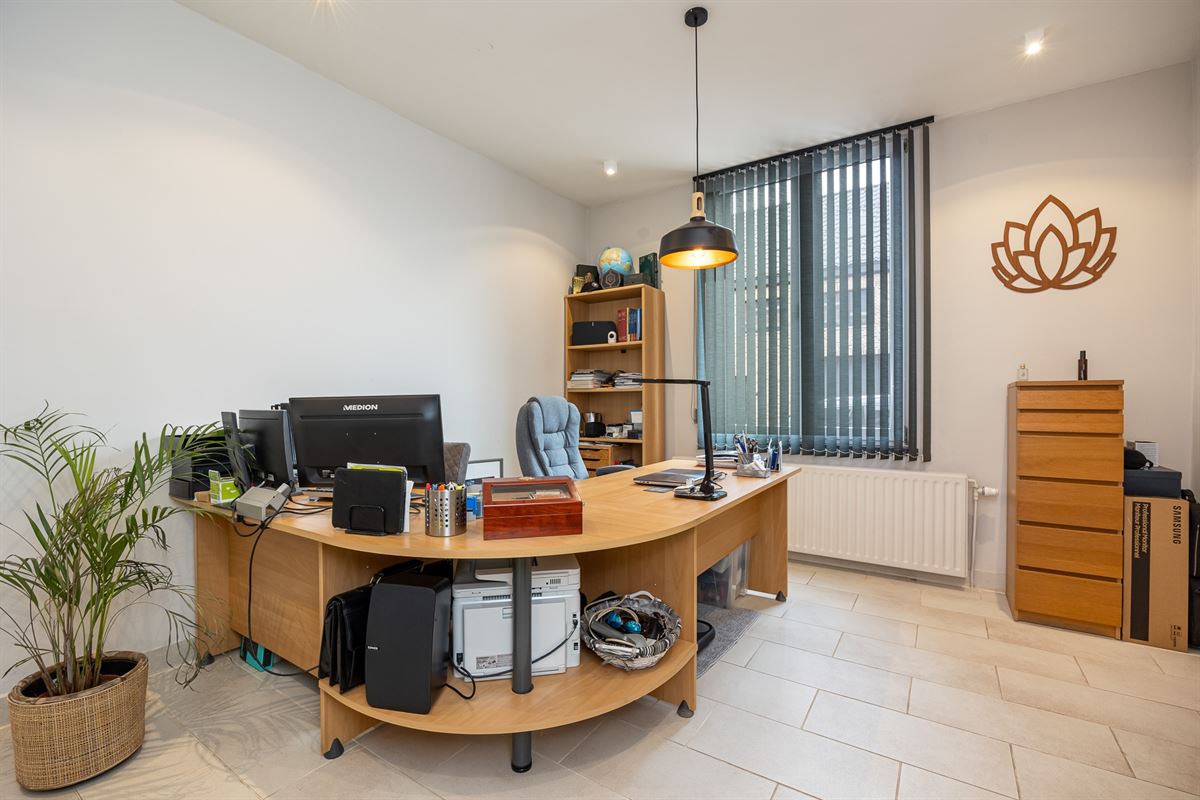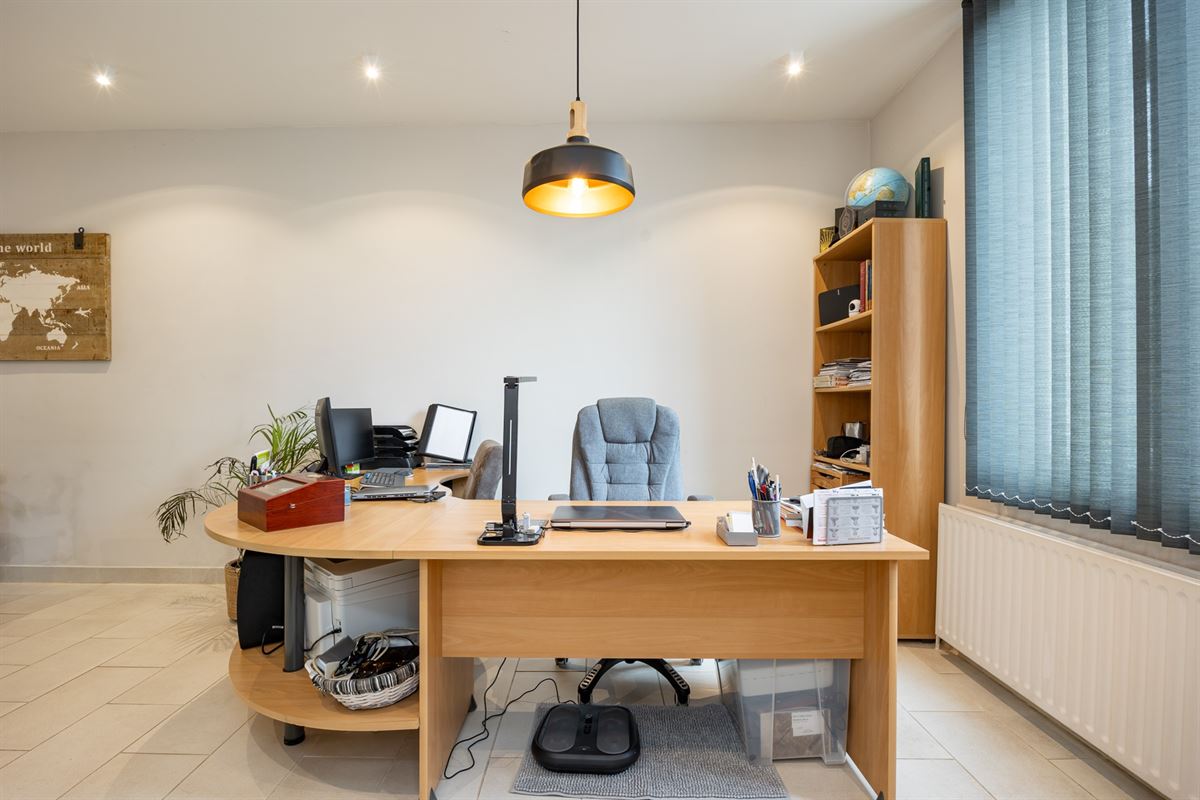 Bij het betreden van de woning kom je terecht in een ruime inkomhal. Rechts is er een bureauruimte, perfect als thuiskantoor. De eetkamer en leefruimte vormen een open geheel en krijgen veel natuurlijk licht dankzij de grote schuiframen.
