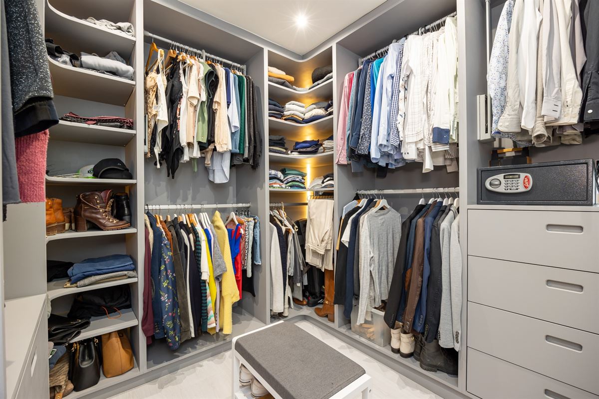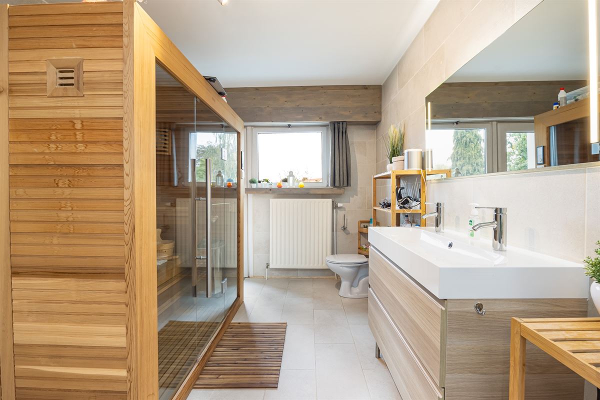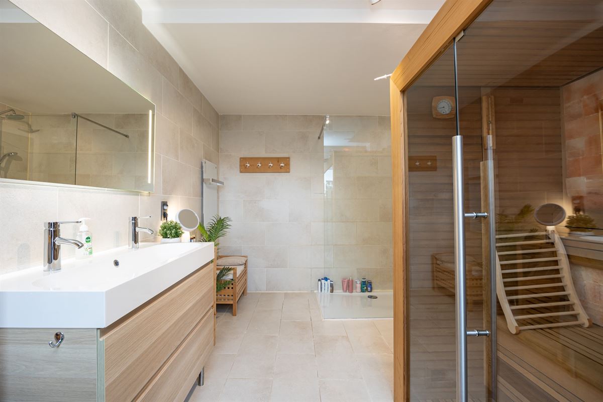 Op de eerste verdieping zijn er twee slaapkamers van 17 m² en 10 m². De grootste heeft een ingebouwde dressing, de tweede wordt momenteel gebruikt als wasruimte. De badkamer is uitgerust met een inloopdouche, dubbele wastafel, toilet en zelfs een sauna. Via de badkamer kom je op een terras van 6 m².