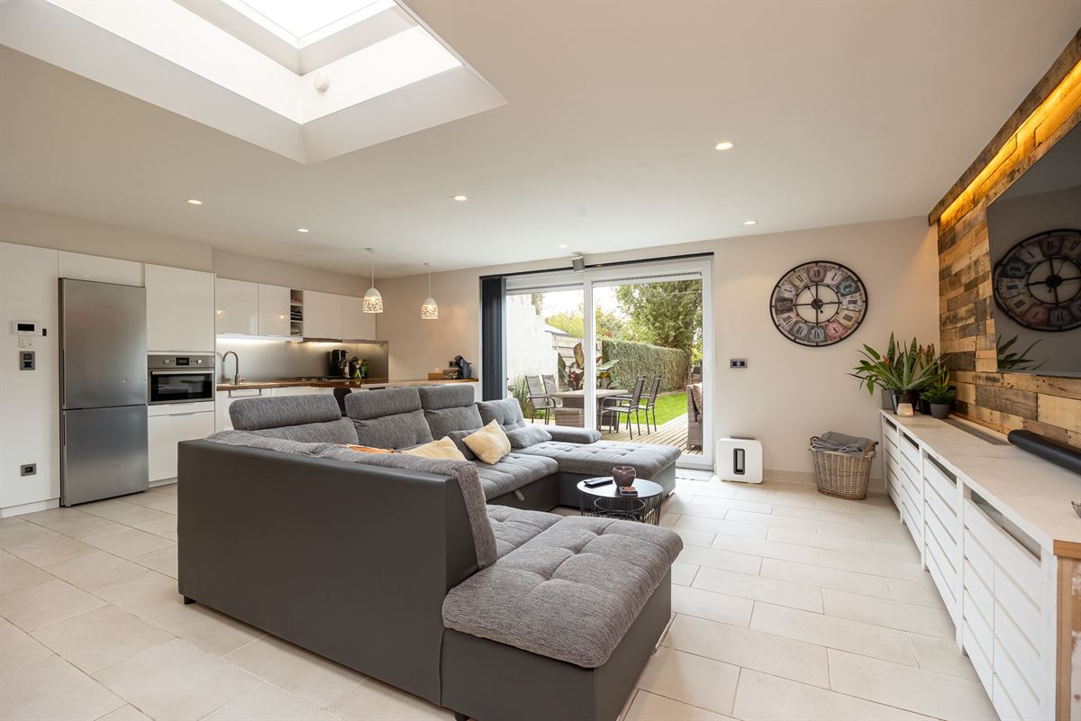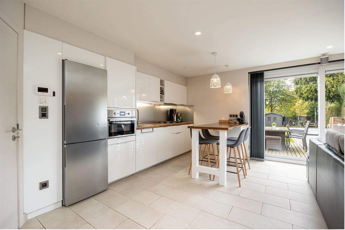 De open keuken is volledig uitgerust met keukentoestellen, waaronder een gasfornuis, dampkap, oven, vaatwasser en koelkast. Op het gelijkvloers bevinden zich tevens een apart gastentoilet en een inpandige, geluidsdichte garage.