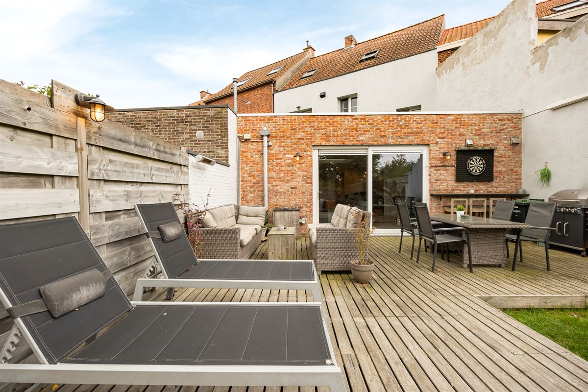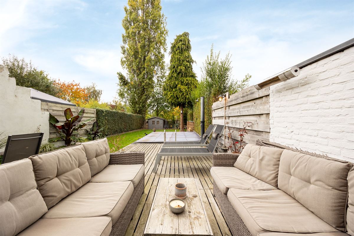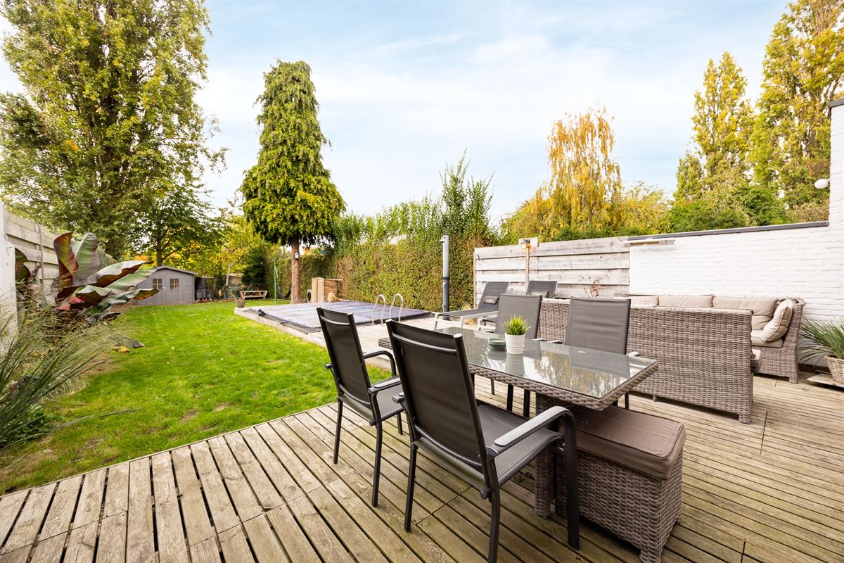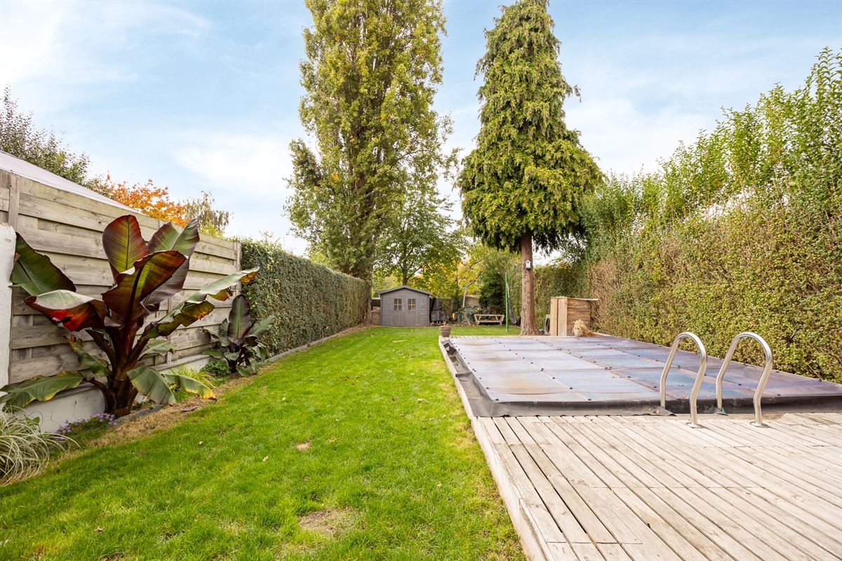 De tuin is ruim en praktisch ingericht, met een gezellig terras, een verwarmd zwembad, buitendouche en een tuinhuis achteraan.